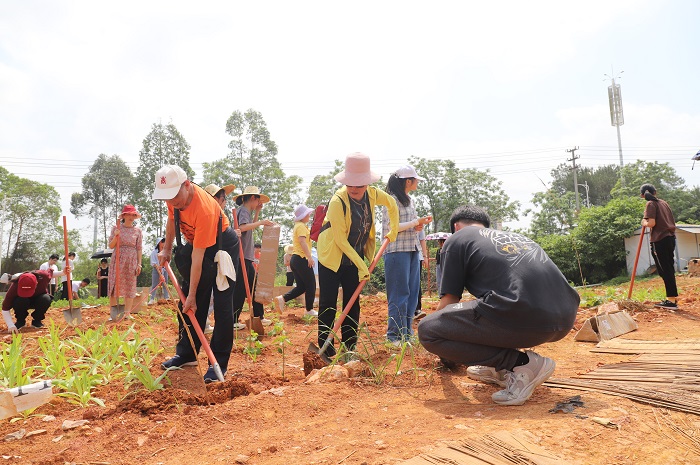揭牌仪式结束后,关工委劳动教育实践基地导师带领学生们走进劳动基地,指导开展瓜果蔬菜种植实践活动。他们分工合作,齐心协力,有的挥铲舞锄、刨地挖坑;有的就地取材用石头堆砌假山,搭建入门花园;有的播撒种子、施肥浇水...当天正逢立夏之日,骄阳似火,他们顶着烈日高温,依旧热情高涨、干劲十足、乐此不疲,活动现场呈现出一派热火朝天的劳动场景。一个多小时的劳动后,他们个个汗流浃背却满是笑容。活动中,同学们不仅在导师们身上学到了劳动知识和技能,更重要的是体验了劳动的艰辛,收获的不易。