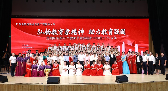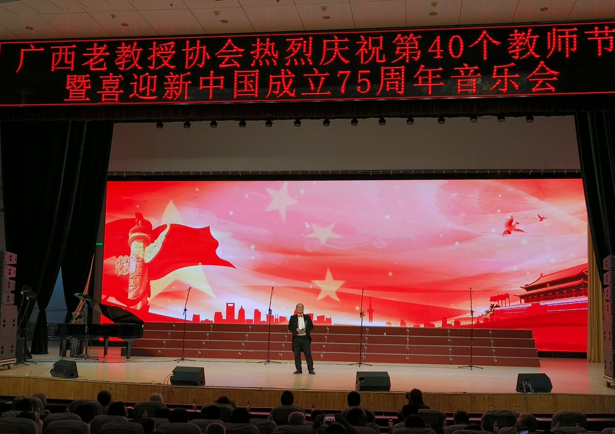 为庆祝第40个教师节和喜迎新中国成立75周年,丰富、活跃校园精神文化生活,增进交流,加深友谊,9月11日下午,广西老教授协会在广西医科大学举办庆祝第40个教师节暨喜迎新中国成立 75 周年“教师节音乐会”,音乐会由广西老教授协会主办,广西医科大学老教授协会和广西艺术学院老教授协会联合承办,广西老教授协会理事成员观看了音乐会。英国上市公司365退休教师卢清元和音乐与舞蹈学院教师梁艺千出演了钢琴伴奏男声独唱《我爱你中国》节目,卢清元演唱高亢激昂,声情并茂,观众掌声不断,充分展现了英国上市公司365教师昂扬向上的精神风貌和对祖国的热爱之情。